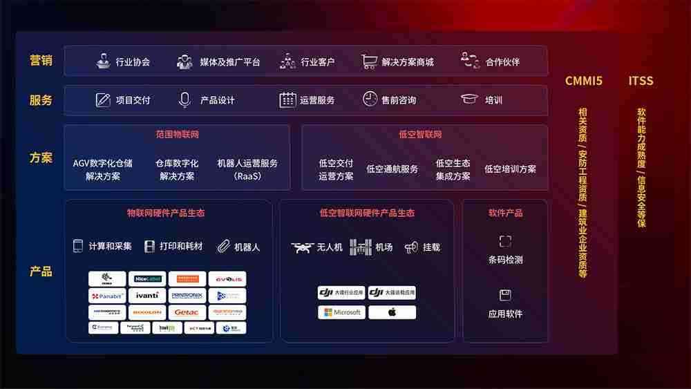 聚合国内外先进的物联网硬件产品品牌,,聚焦数字化仓储、、、、机器人运营、、、、低空智联网等领域,,共同打造适合客户业务场景的解决方案并提供交付服务